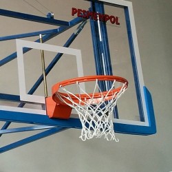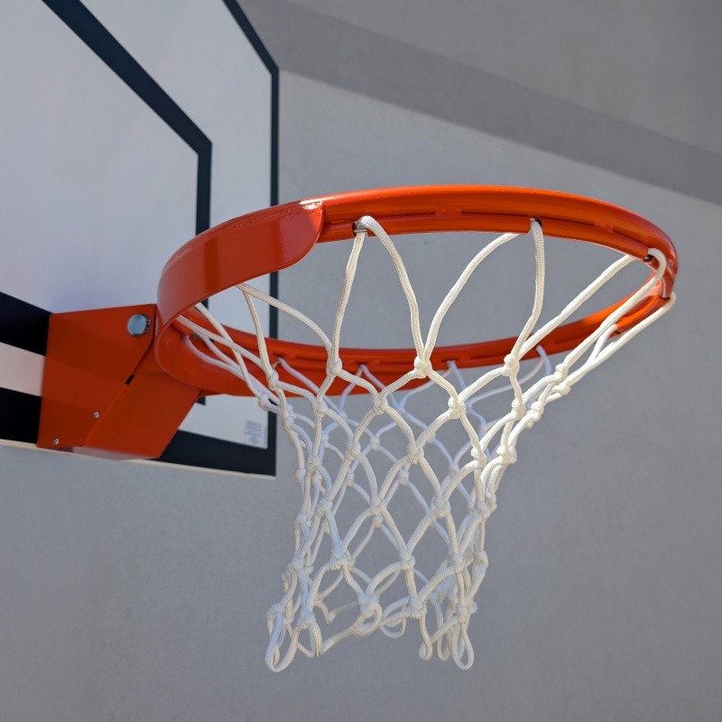 Откидные баскетбольные кольцо с пружинами и дополнительным усилением, с порошковым покрытием, предназначенное для использования в спортивных залах. Cетка установлена на стержне