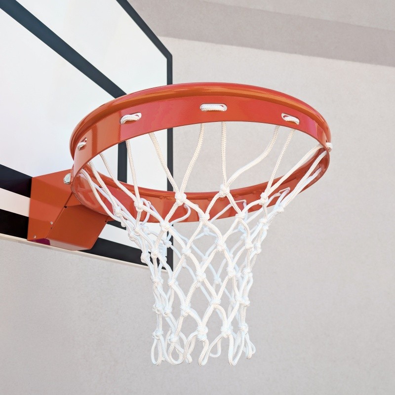 Откидные баскетбольные кольцо с пружинами и дополнительным усилением, с порошковым покрытием, предназначенное для использования в спортивных залах. Cетка установлена при помощи фланца