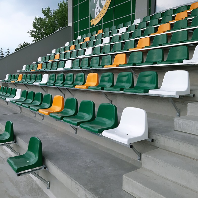 Цельные пластиковые сиденья, установленные на стальной конструкции из горячеоцинкованной стали на ступеньке или подступенке уличной спортивной трибуны с бетонными или стальными ступенями и платформами