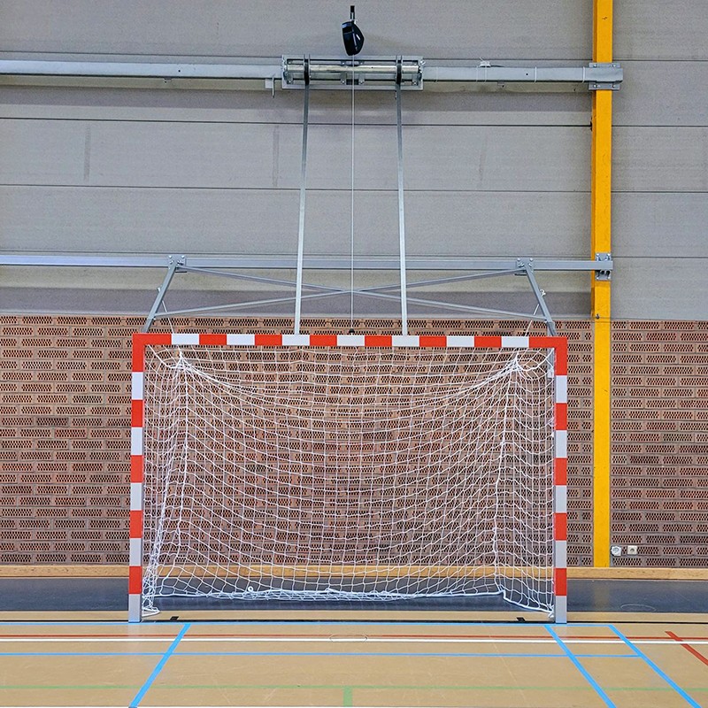 Профессиональные, алюминиевые, усиленные ворота для гандбола (3x2 м), поднимаемые на стену при помощи электрического привода, усиленный профиль 80х80 мм.