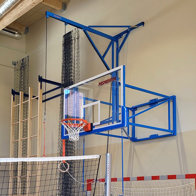 Складной стенной кронштейн для установки гимнастических колец - тип 2 - с плавной регулировкой высоты колес, изготовленный из стальных профилей, с инновационной системой складывания и раскладывания и использованием высококачественного фалового стопора, обеспечивающего безопасность во время упражнений