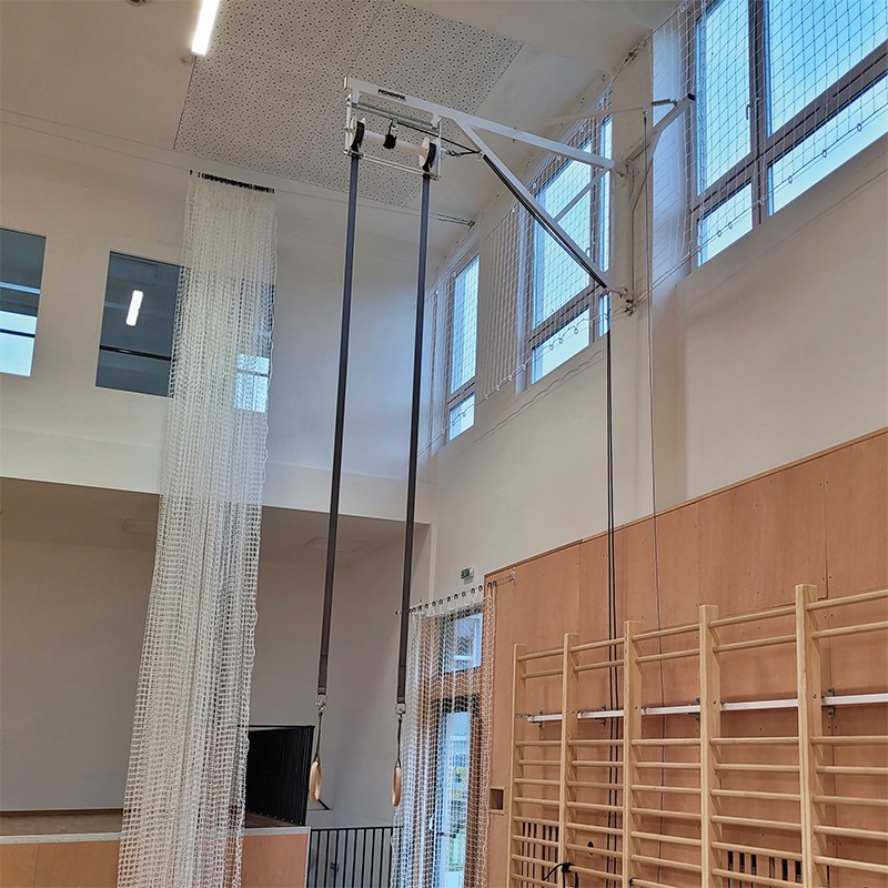 Высота подвеса гимнастических колец плавно регулируется в стандартном диапазоне от 100 до 300 см от пола. Регулировка высоты, а также система складывания и раскладывания быстры и просты. Всё управление осуществляется с помощью тросов, доступных пользователю с уровня пола.