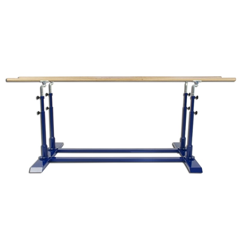 Прочная стальная конструкция с устойчивым основанием, телескопическими вертикальными балками для регулировки высоты и поручнями из высококачественной лакированной ламинированной древесины. Также доступна транспортировочная тележка.