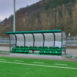 Конструкция двухрядной скамьи для игроков, оснащенной 14 пластиковыми сиденьями со спинкой, изготовлена из стальных профилей с порошковым покрытием и покрыта панелями из камерного поликарбоната толщиной 6 мм, боковые стороны закрыты панелями из твердого поликарбоната. Алюминиевая отделка. Нижняя рама защищена от коррозии горячей оцинковкой. По желанию, скамья может быть дополнительно оснащена защитой верхней перекладины скамейки, изготовленной из пенопласта, покрытого материалом ПВХ.