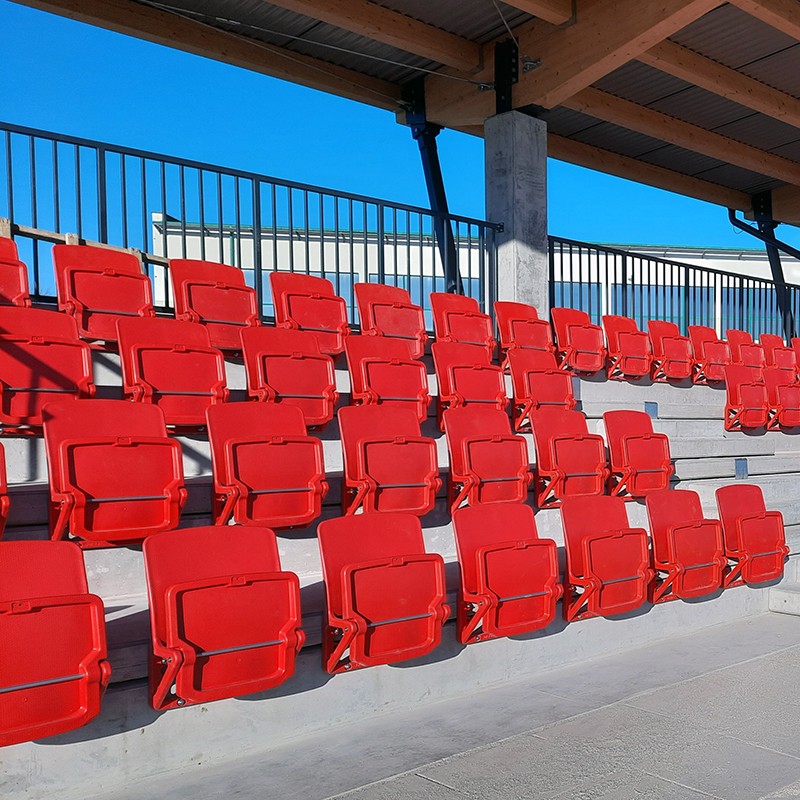 Спортивное кресла с гравитационно складывающимся сиденьем, крепящиеся непосредственно к подступенке уличной зрительской трибуны со ступенями бетонной или стальной конструкции