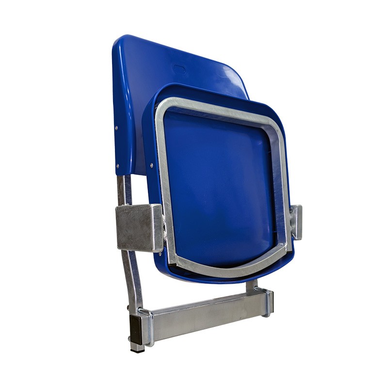 Спортивное кресла с гравитационно складывающимся сиденьем, установленные на конструкции из горячеоцинкованной стали на ступеньке или подступенке уличной спортивной трибуны с бетонными или стальными ступенями и платформами