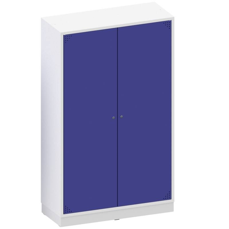 Функциональный металлический шкаф для хранения спортивного оборудования, двухдверный, с двумя вместительными секциями, с четырьмя полками и вешалками, размер 200x120x49 см, окрашен порошков краской, плинтус