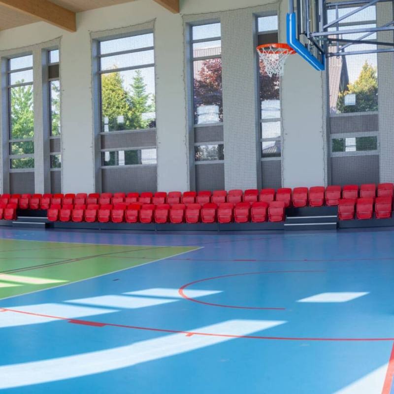 Стационарная трибуна для спортзалов с пластиковыми сиденьями, подступеньками из стального листа и площадками из нескользящей фанеры.