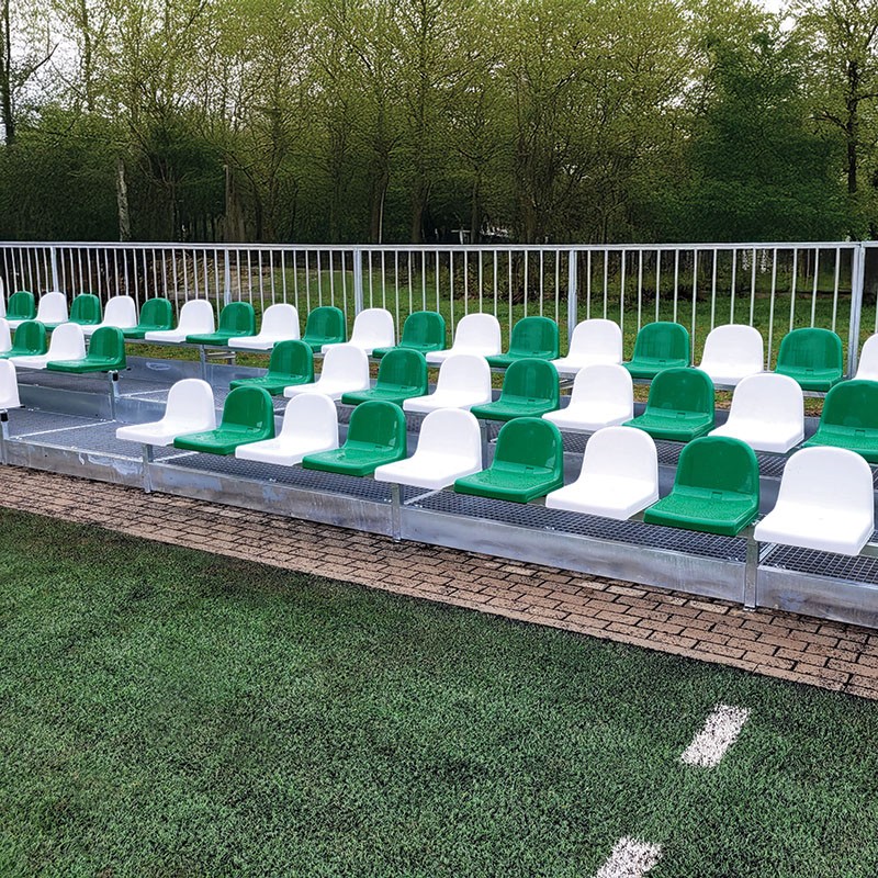 Портaтивная съемная спортивная трибуна TSD 200 с пластмассовыми сиденьями и регулируемыми стопами, платформы из решетки VEMA, подступеньки из стального листа, стальная, оцинкованная конструкция; сертификат соответствия стандартам EN-PN