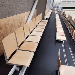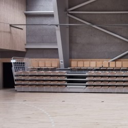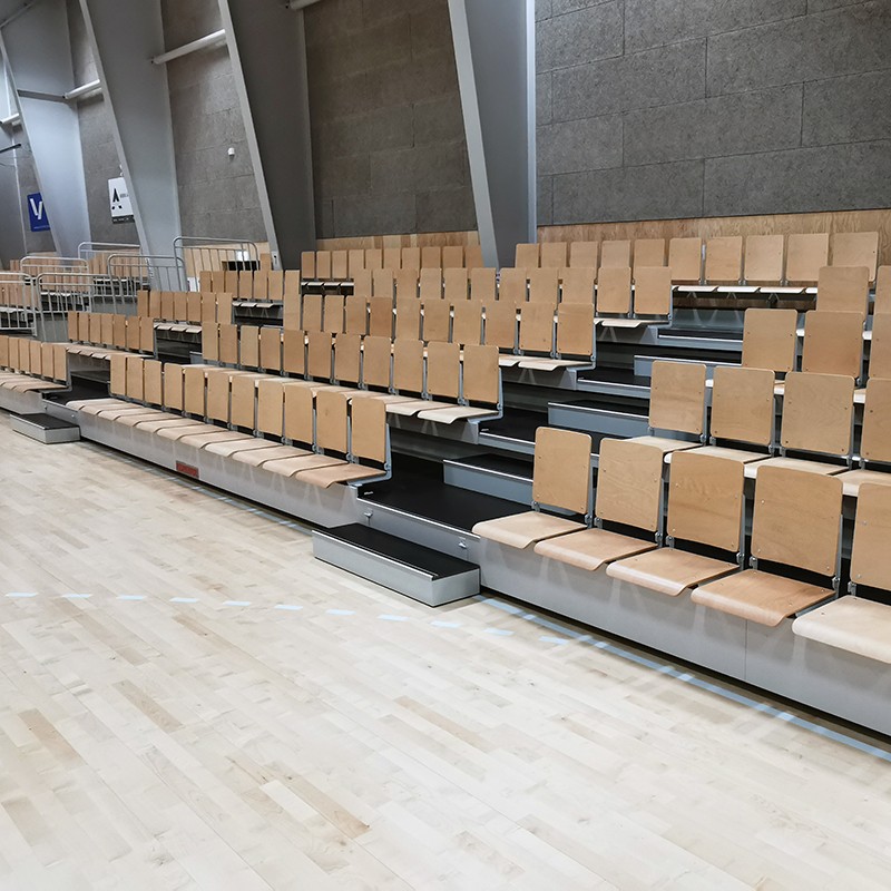 Телескопическая трибуна с ручным или электрическим приводом, с сиденьями со складной спинкой, сиденья из фанеры бука, сертифицирована на соответствие стандартам PN-EN