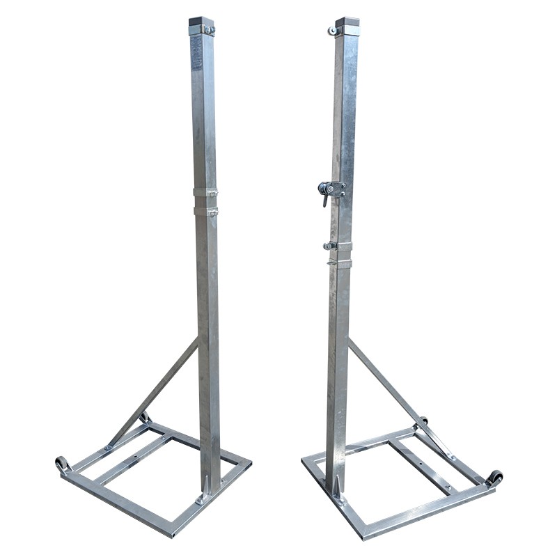 Волейбольные, стальные стойки (профиль 80х80 мм), многофункциональные с основой из рамы прикручиваемой к полу, плавная регулировка высоты (волейбол, теннис) - механизм натяжения с барабаном