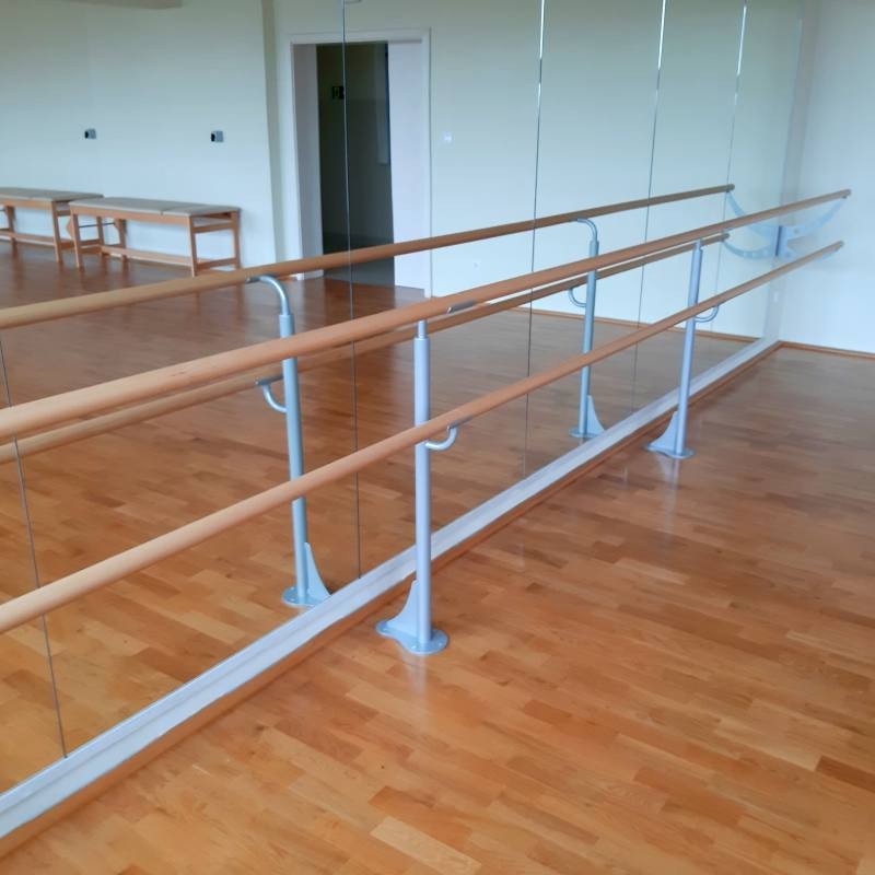 Гладкие настенные зеркала толщиной 4 мм, установленные на ДСП, доступны в версиях с однорядным или двухрядным хореографическим станком на кронштейнах или без станки, для спортивных залов фитнес-залов или танцевальных залов